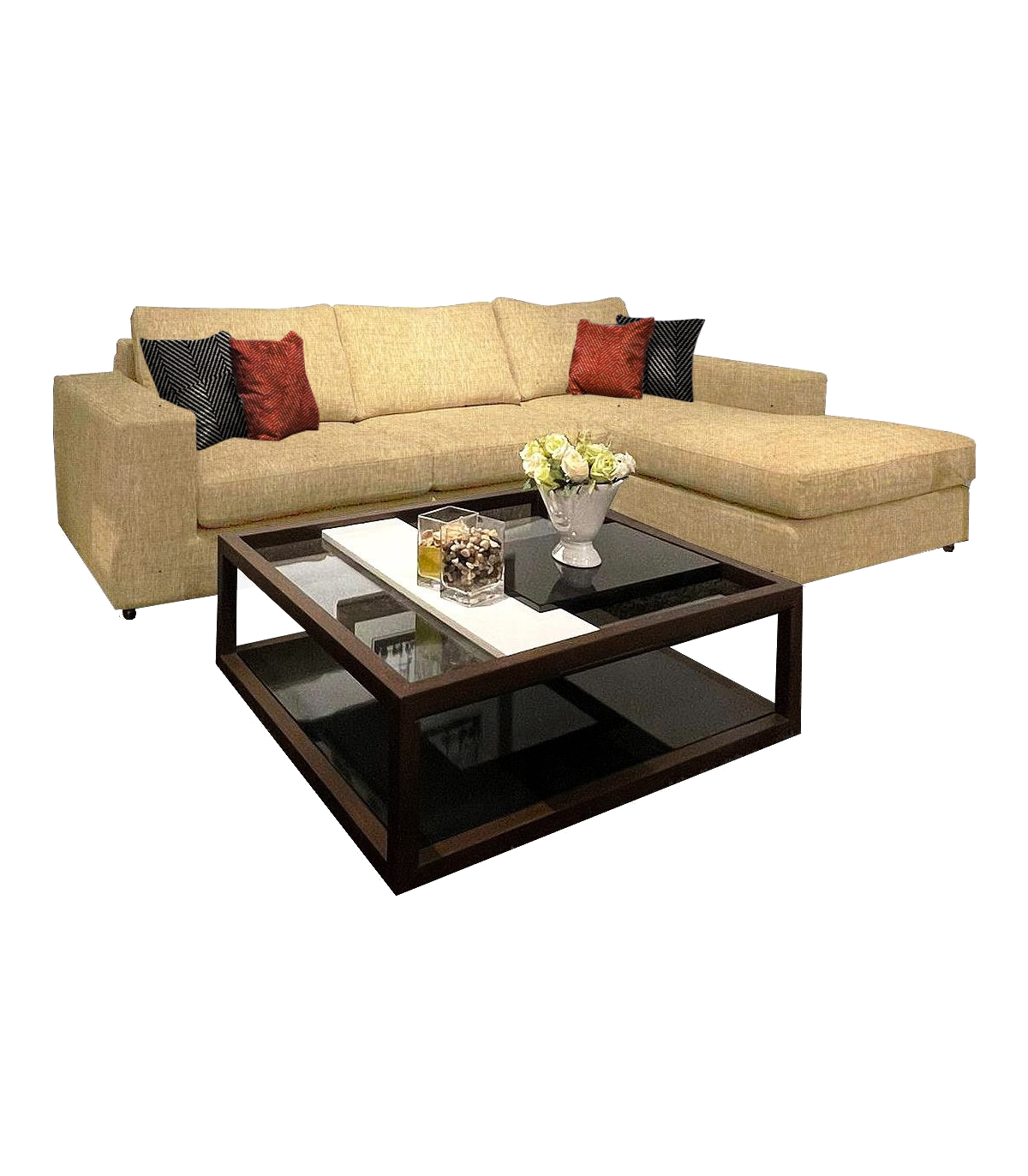 View Details Douglas-L Douglas-L L-shaped sofa made in seat with foam filling, and throw pillow insert with feather, upholstered in fabrics or leather, legs in polypropylene.